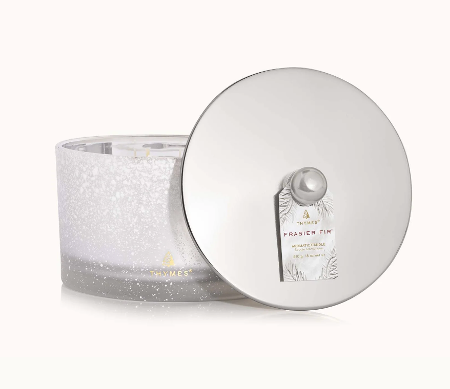 Enjoy the classic Frasier Fir scent with the Thymes large 3-wick flocked candle. It fills your space with fresh fir needles, cedarwood, and sandalwood, creating a warm and inviting atmosphere.