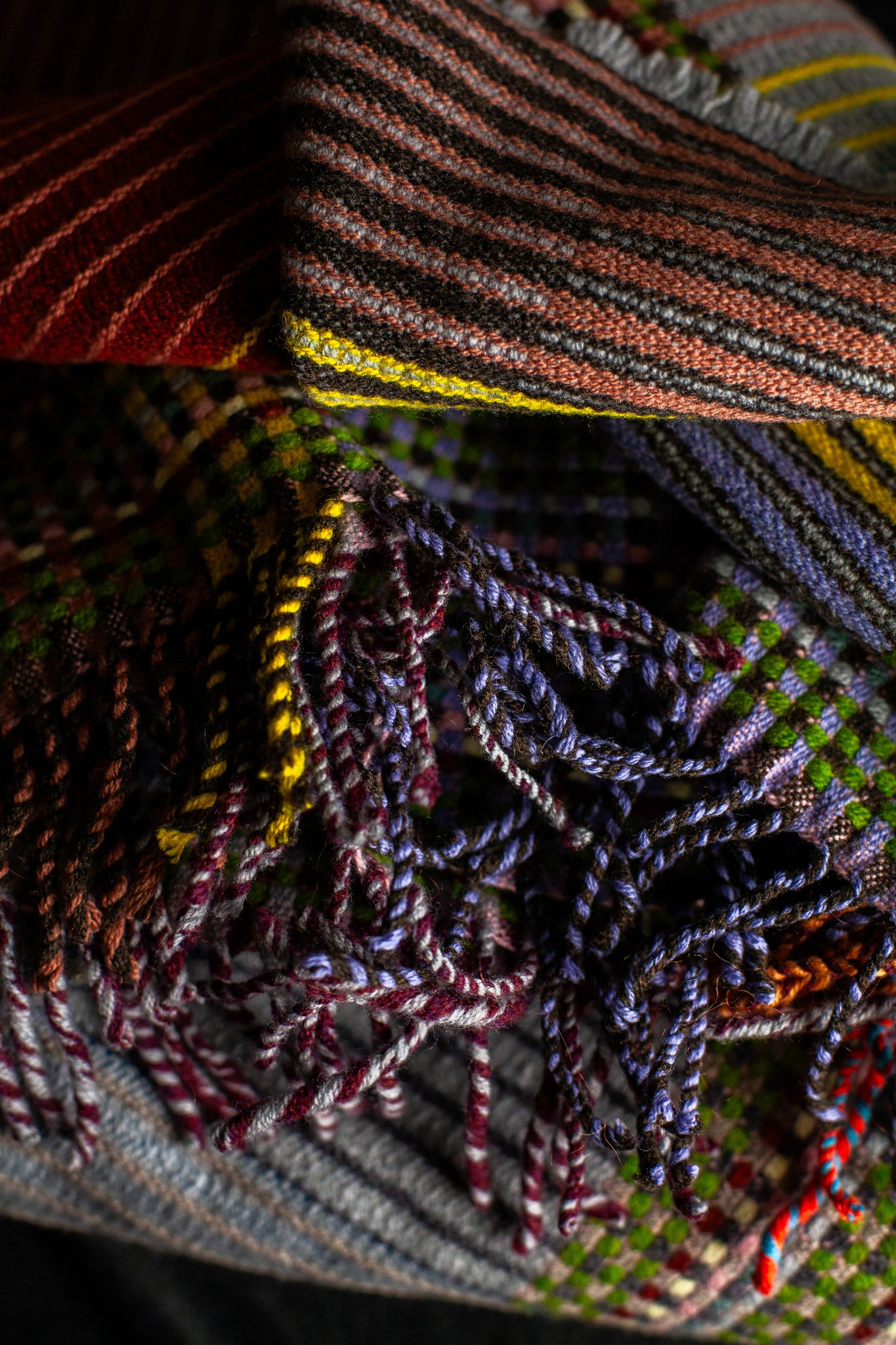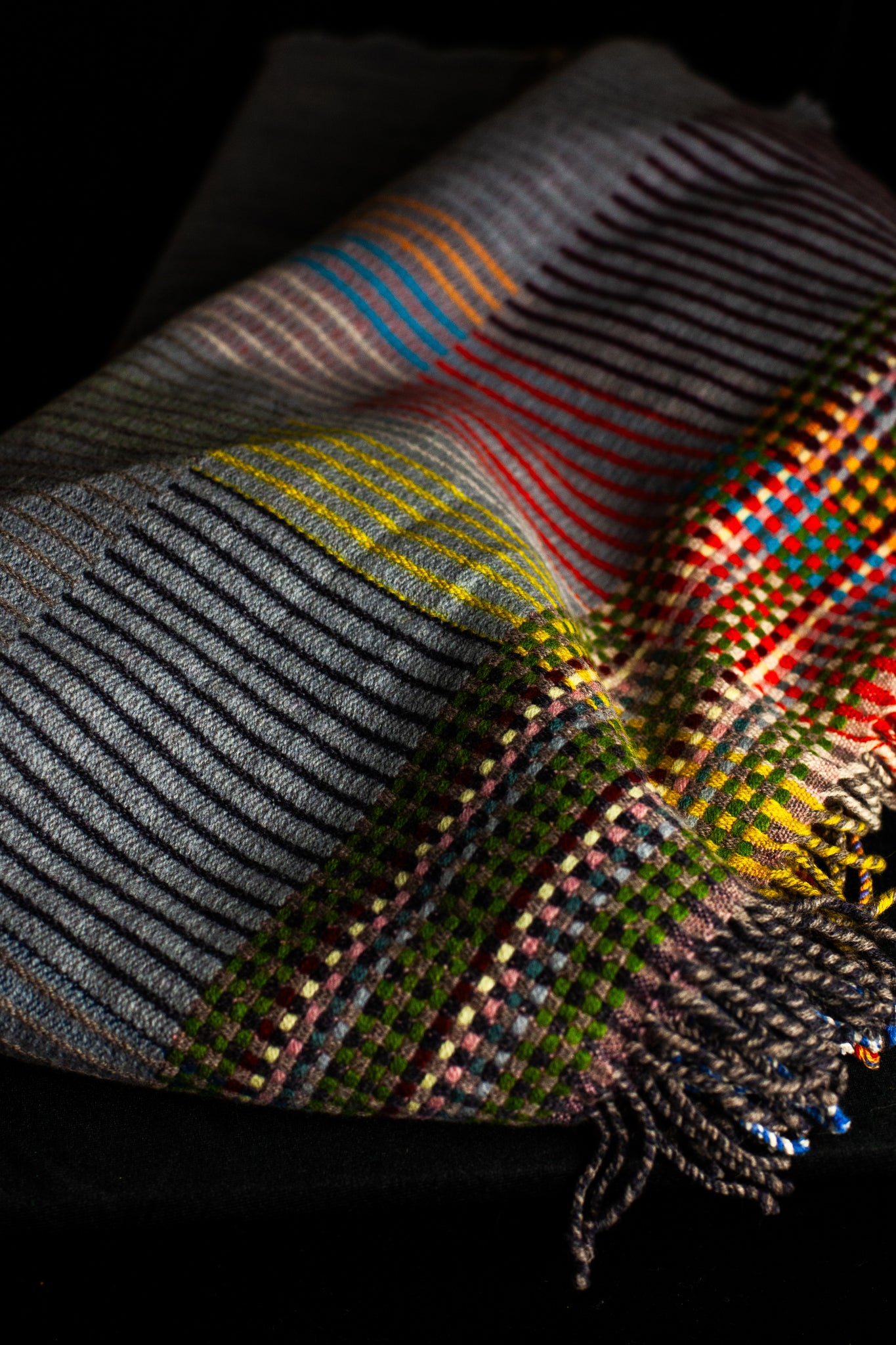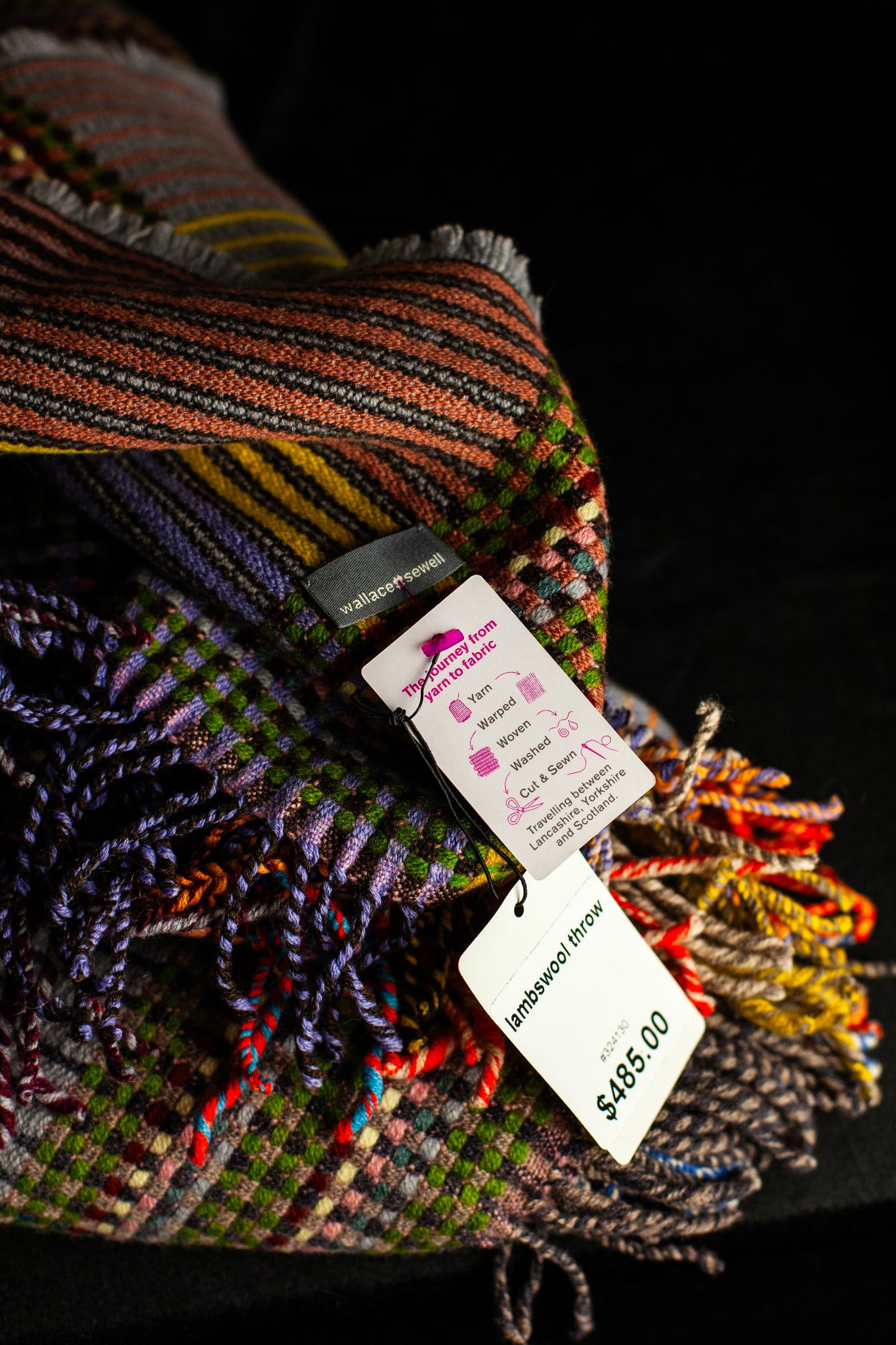 Wallace Sewell's Florence throw showcases a sophisticated interplay of design and color. Crafted from premium merino lambswool, this double-sided piece features bold colored blocks intersected by fine woven pinstripes, creating dynamic visual depth. Earthy greens and browns alternate across each side, framed by a distinctive pixelated border. Measuring 115 x 195 cm, it's an artful textile investment for any interior.
