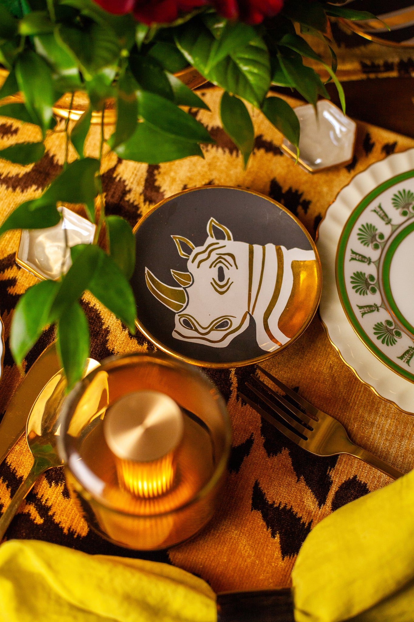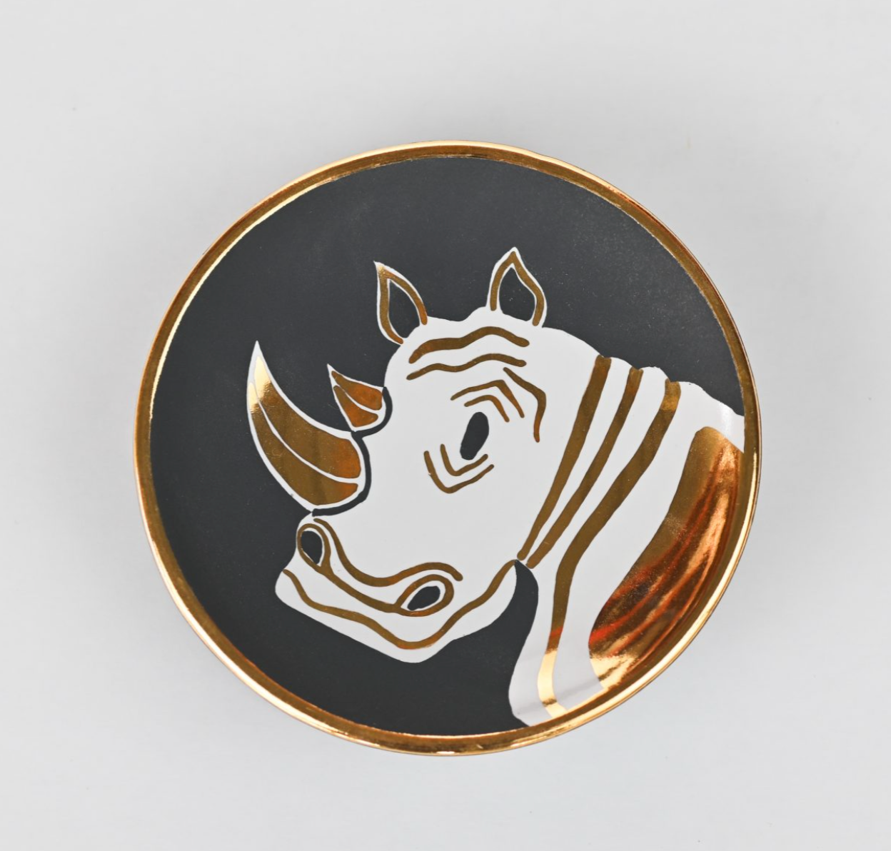Waylande Gregory handcrafted ceramic bowl with ultra matte glaze and 22k gold details. Measures 4.5" diameter x 1.5" tall. Hand wash only with mild soap; avoid abrasive cleaners. Not dishwasher or food safe. Made in Peru.