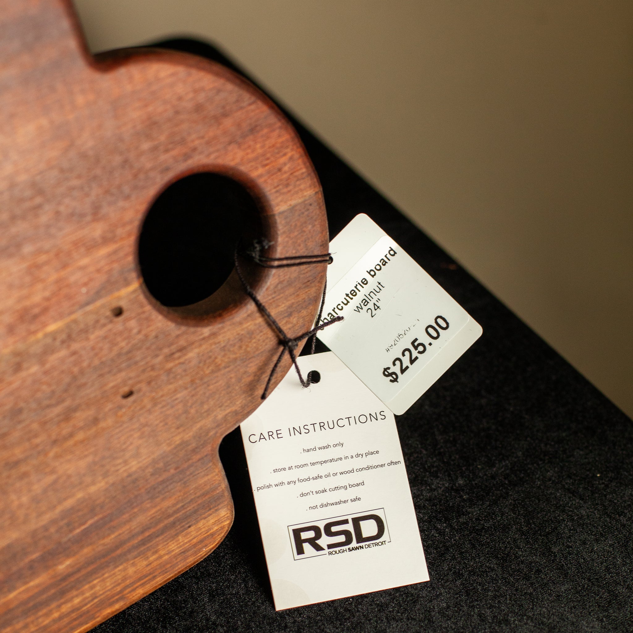 Crafted from Detroit salvaged walnut with a distinctive finish, this 24" charcuterie board combines rustic character with refined functionality. The natural grain and textured surface showcase the wood's authentic beauty, making it an ideal serving piece for entertaining or display.