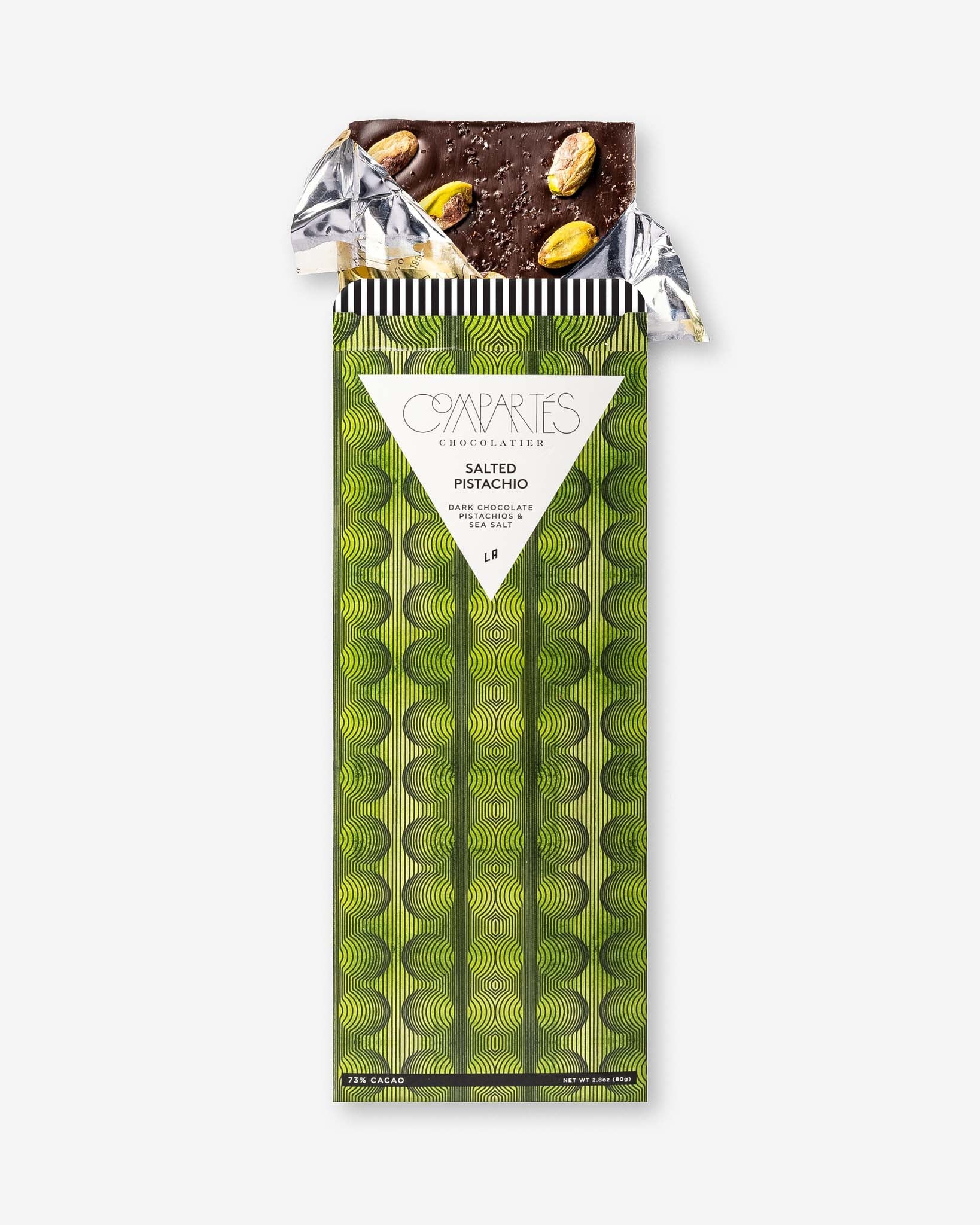 Indulge in Compartés's Salted Pistachio dark chocolate bar—a sophisticated blend of roasted pistachios and premium dark chocolate, finished with a delicate sea salt touch. Handcrafted in Los Angeles, this artisanal bar delivers the perfect balance of nutty richness and subtle salinity. Beautifully packaged in designer green graphics, it's an elegant treat for chocolate connoisseurs.
