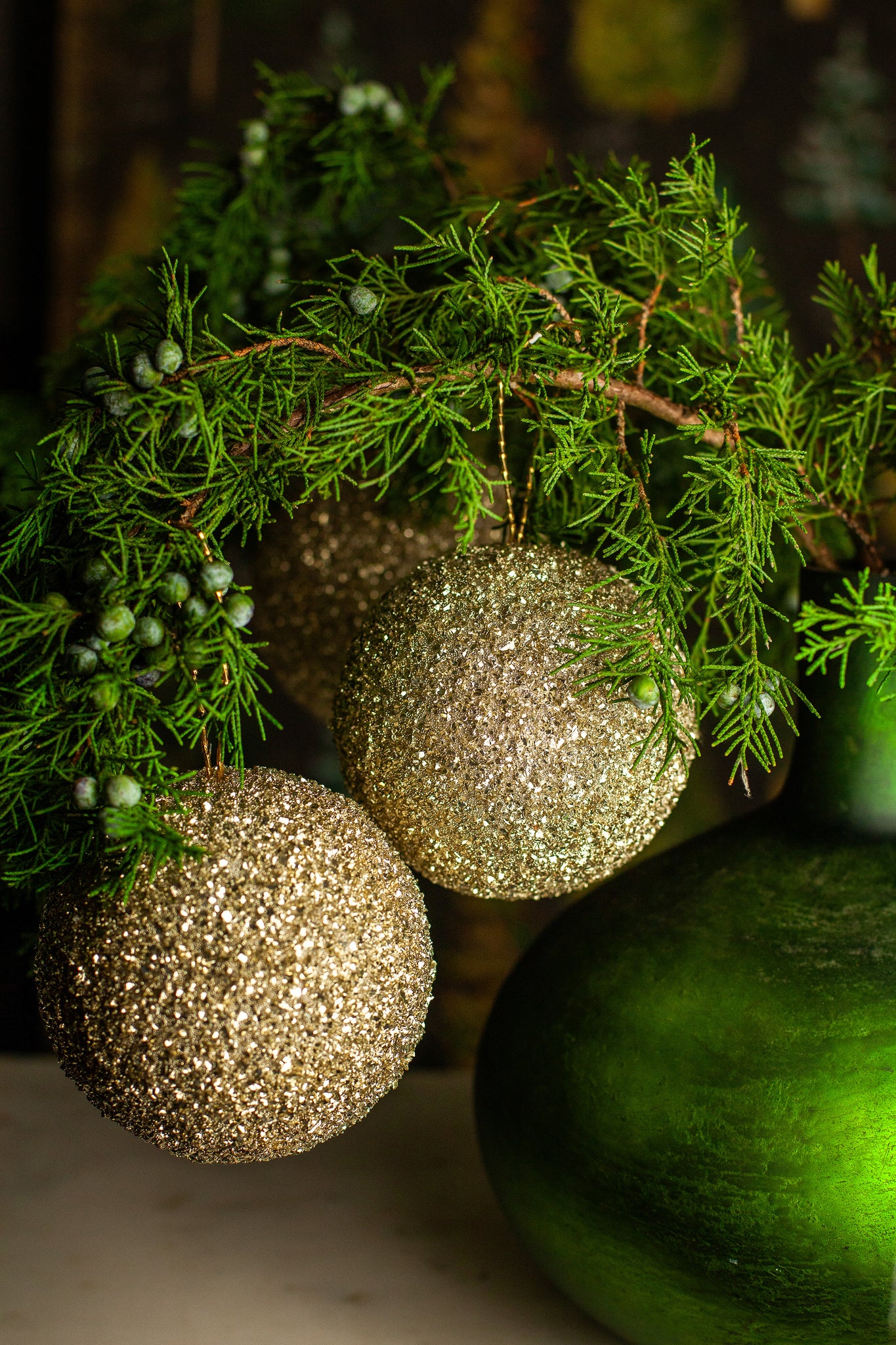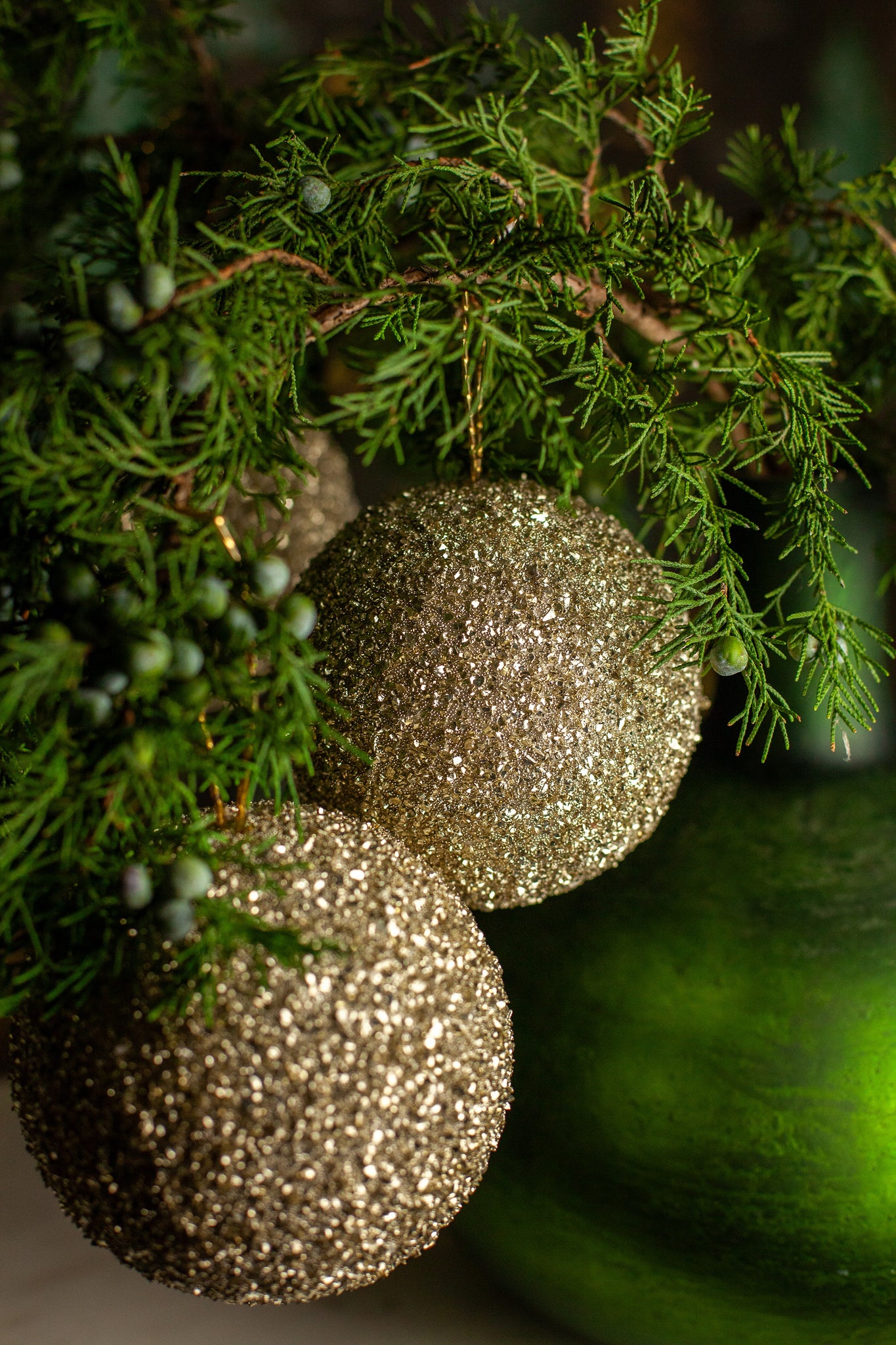 Elevate your holiday décor with this exquisite set of three Champagne Gold Glitter Bulb Ornaments. Each bulb is expertly coated to achieve a luxurious, shimmering finish that resembles a delicate dip in fine glitter, adding sophisticated sparkle to your tree or festive arrangements.