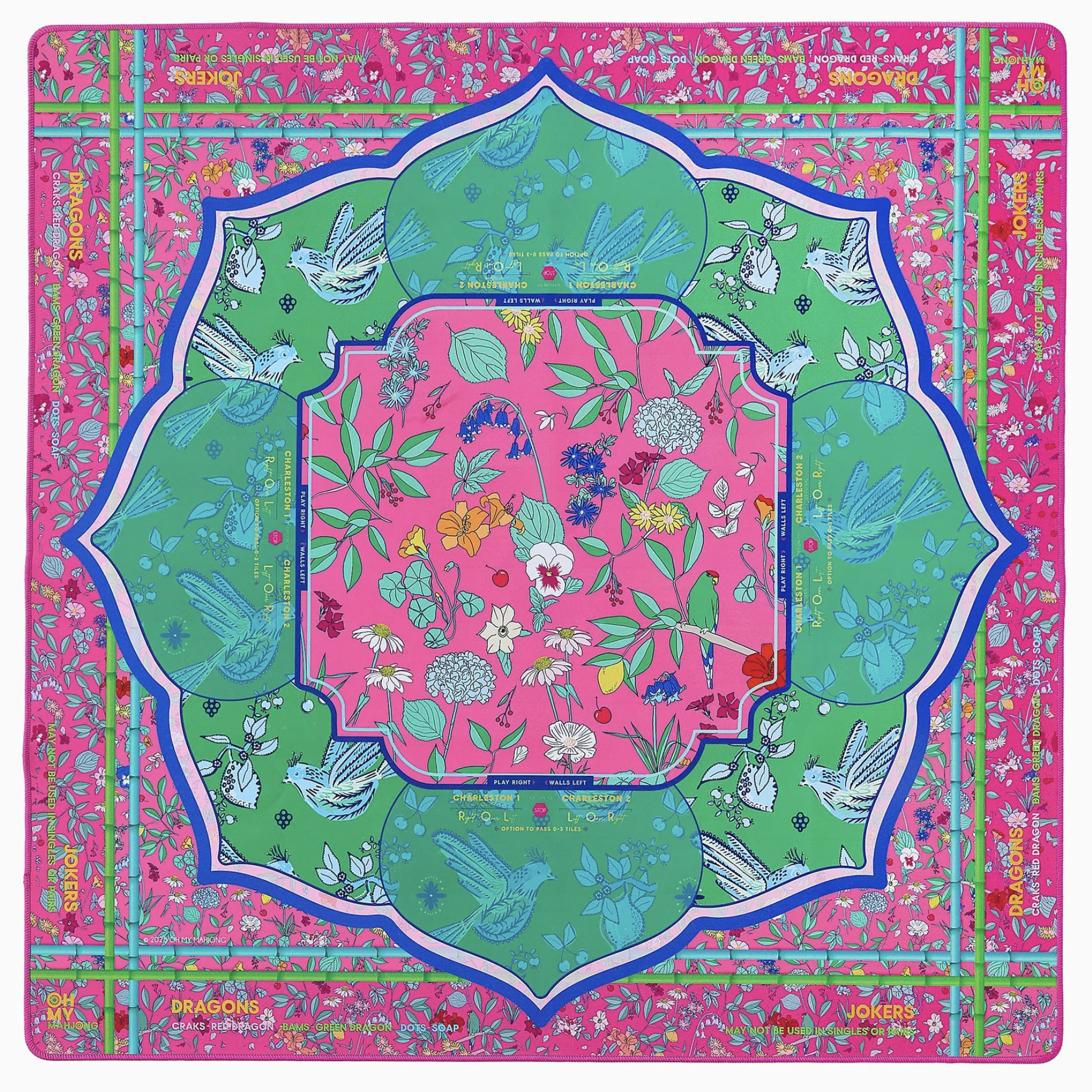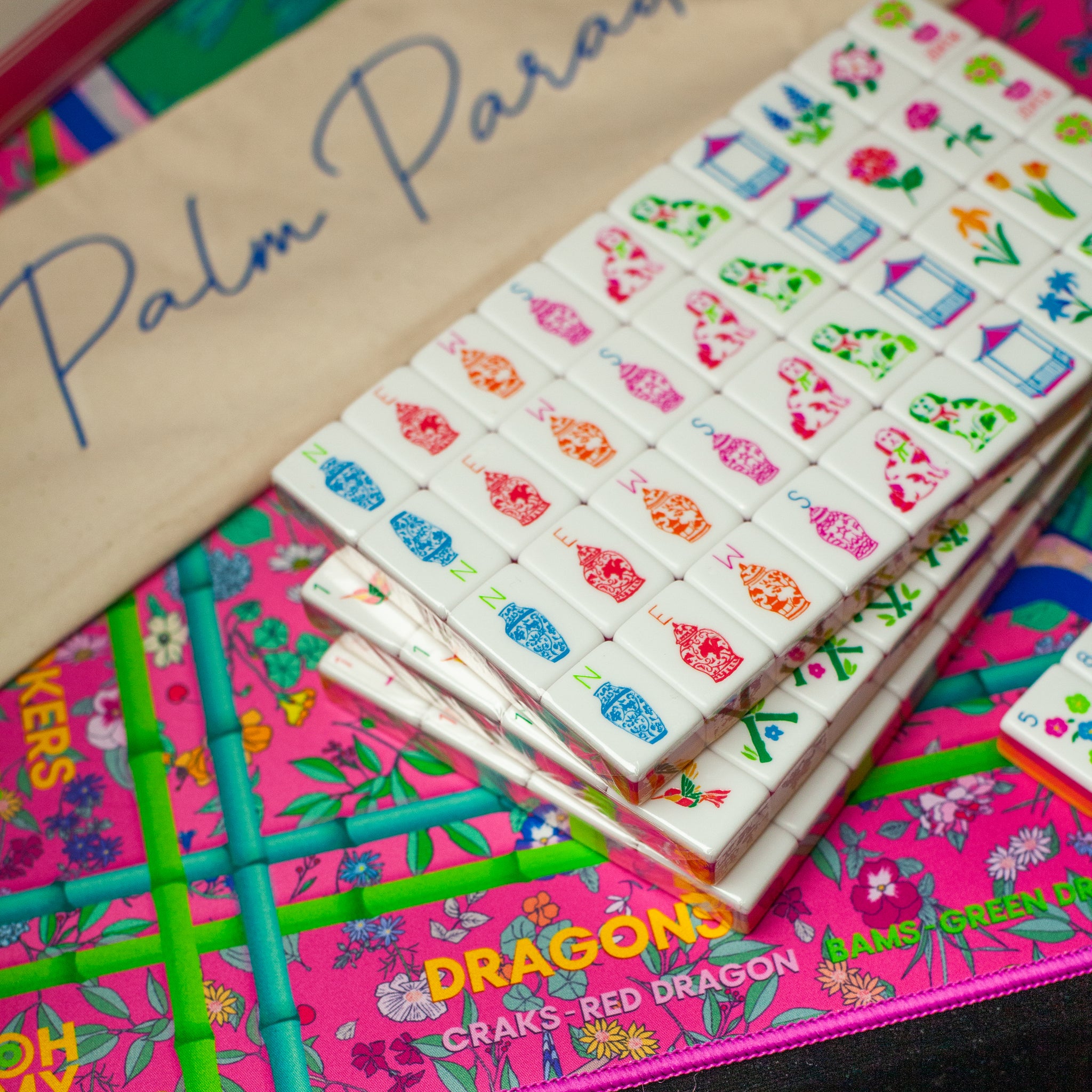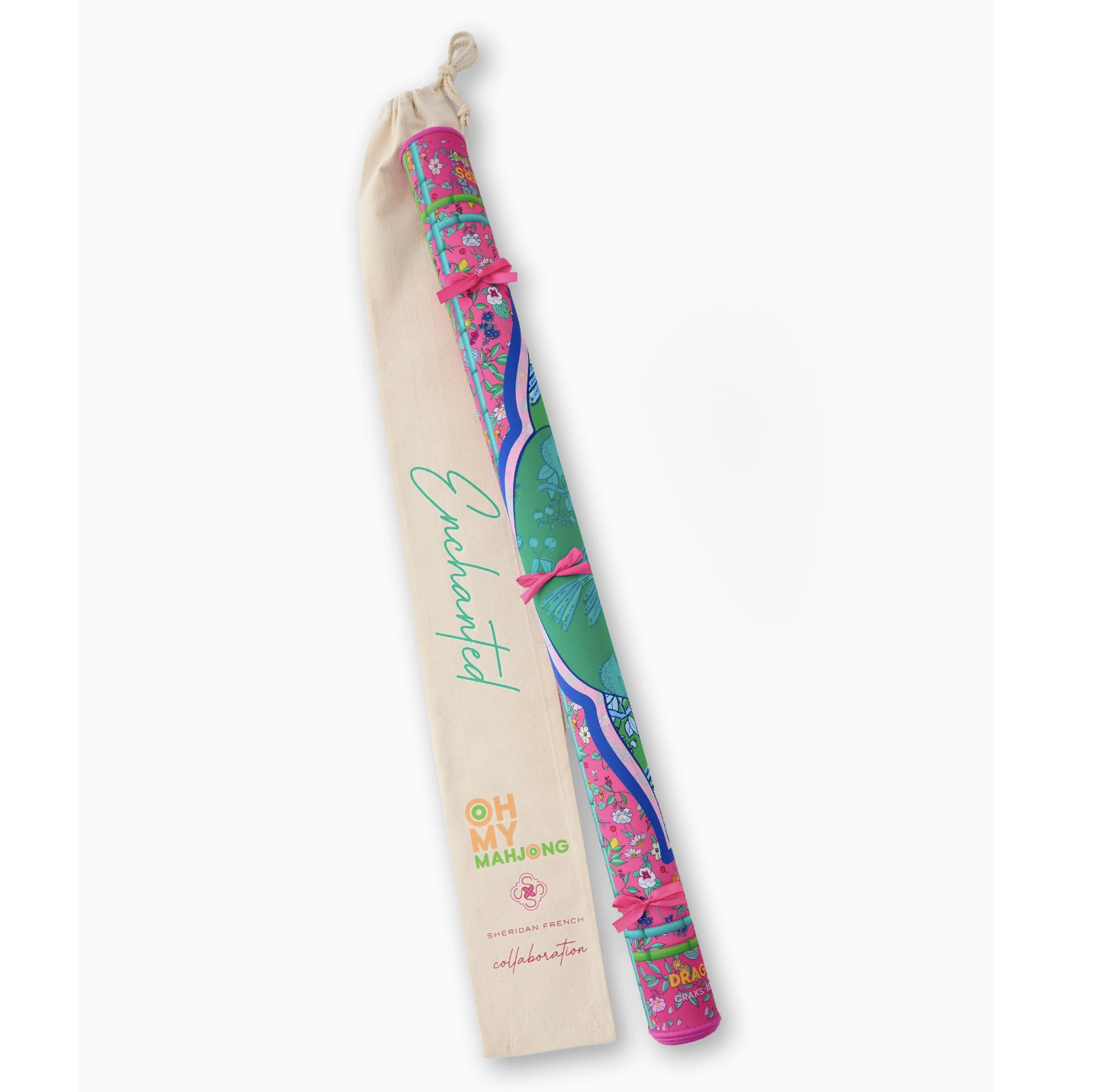 Complete Mahjong Set, in Enchanted/Jasmine featuring a vibrant collaboration with designer Sheridan French. The 33" x 33" mat showcases bold wildflowers in bright pink, kelly green, and jewel tones, arriving in a canvas drawstring bag. The Jasmine Tiles blend kelly green, muted lime, and deep blue for nature-inspired gameplay. Complete set includes 160 acrylic tiles, mat, rack, pusher, shuffler, scorecard, dice bag, and instructional cards.