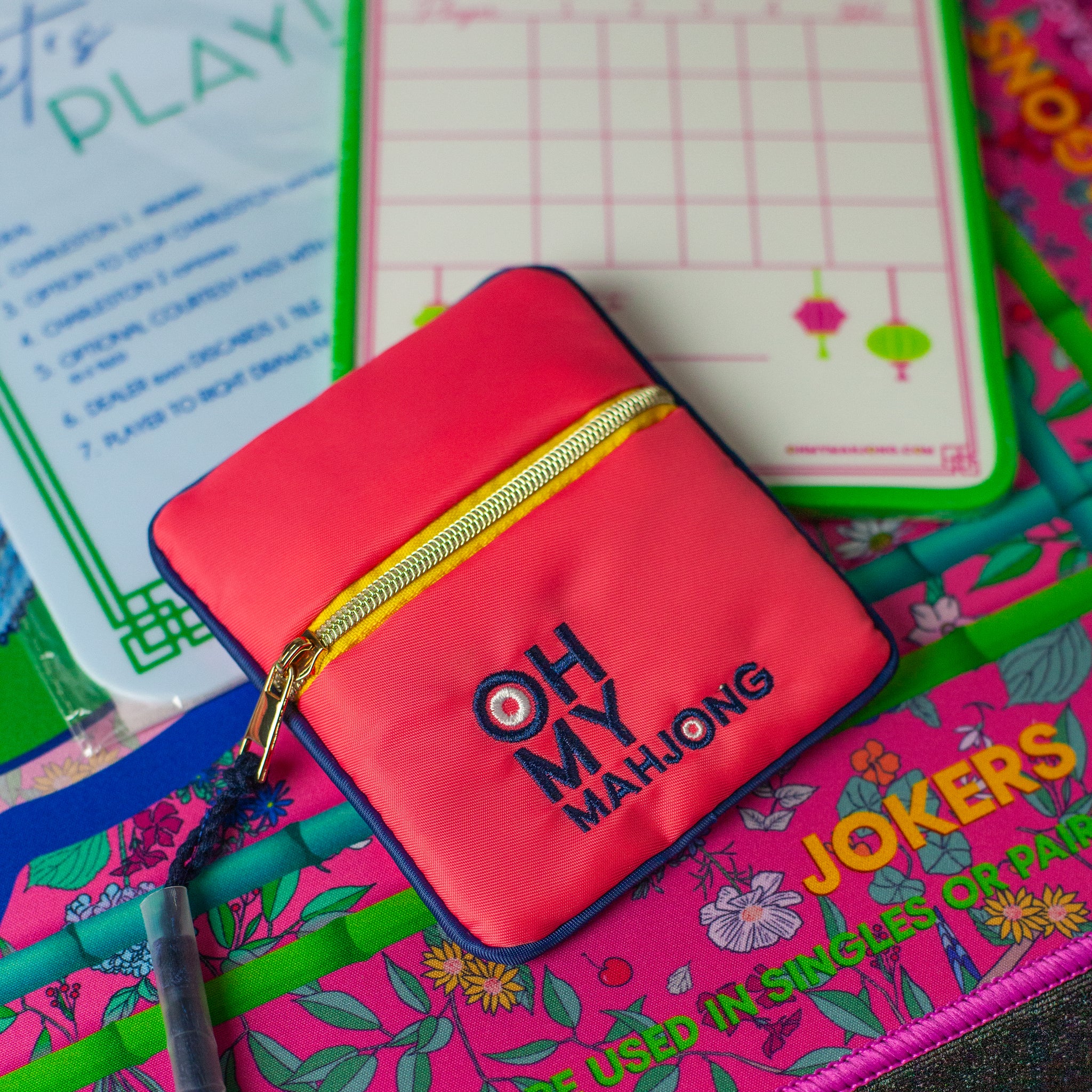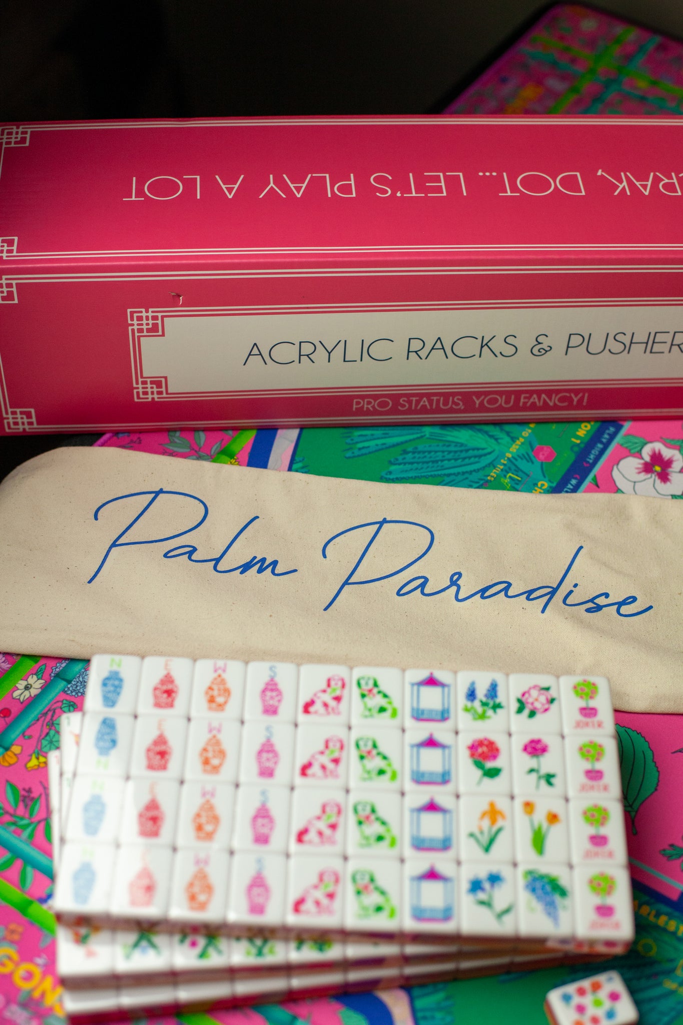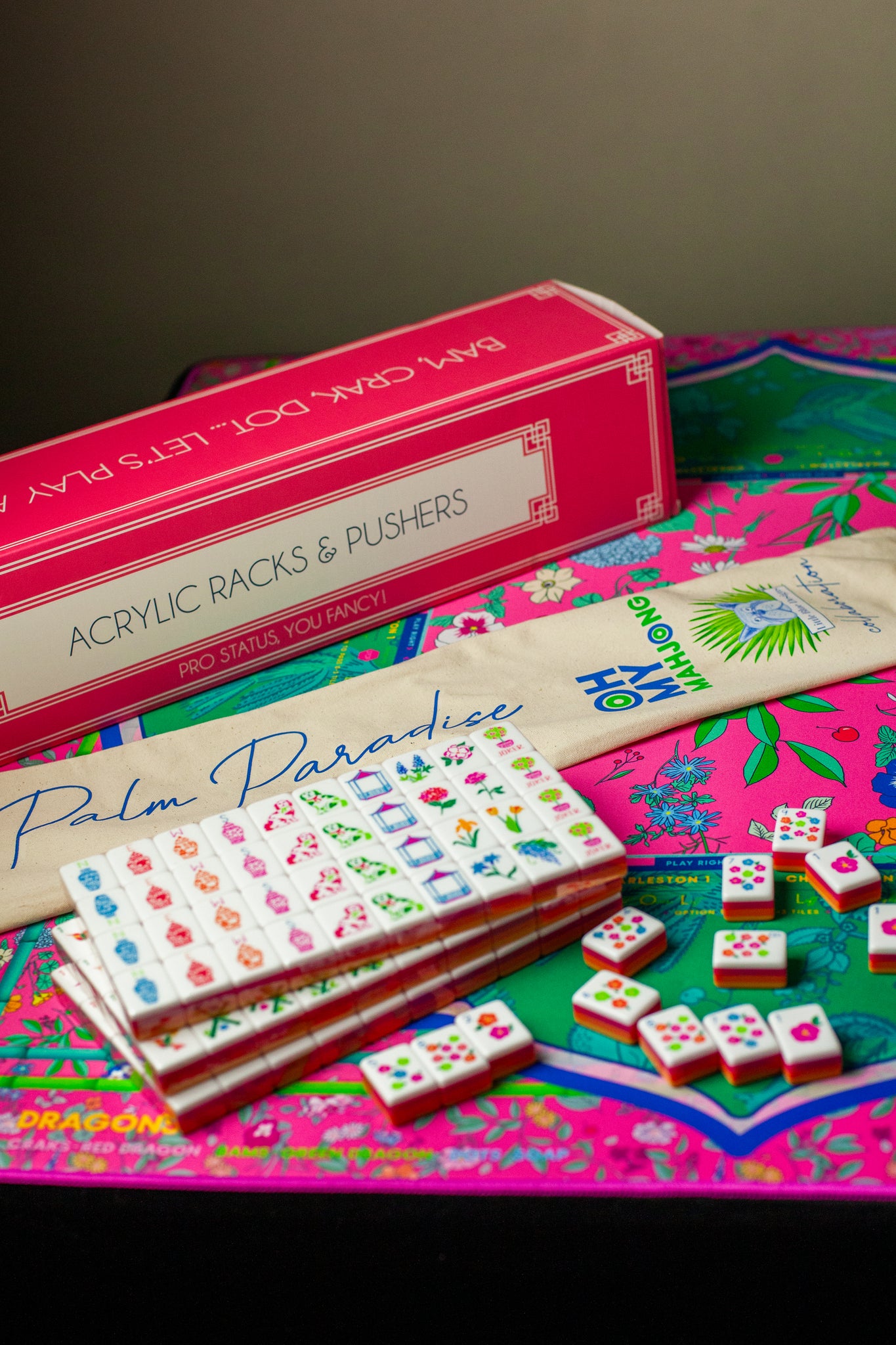 Complete Mahjong Set, in Enchanted/Jasmine featuring a vibrant collaboration with designer Sheridan French. The 33" x 33" mat showcases bold wildflowers in bright pink, kelly green, and jewel tones, arriving in a canvas drawstring bag. The Jasmine Tiles blend kelly green, muted lime, and deep blue for nature-inspired gameplay. Complete set includes 160 acrylic tiles, mat, rack, pusher, shuffler, scorecard, dice bag, and instructional cards.