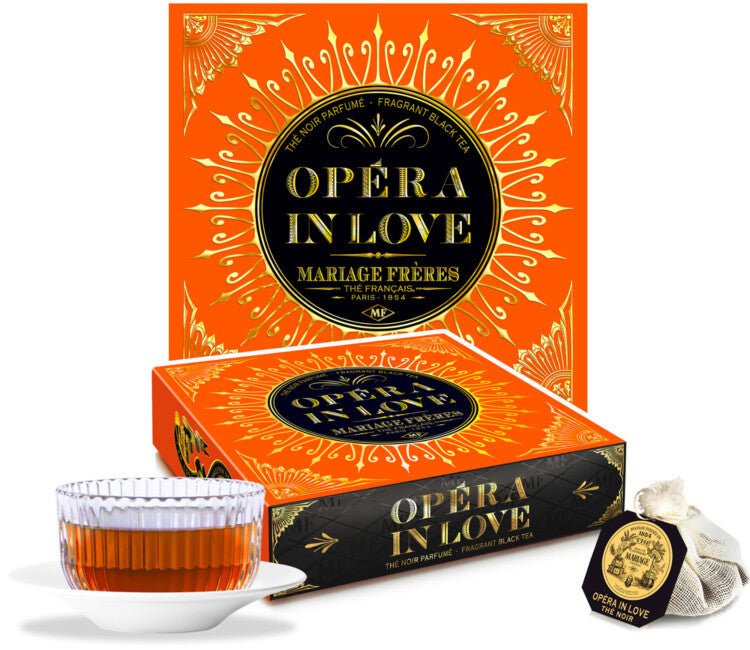 OPÉRA IN LOVE® captures the grandeur of an evening at the opera with a sophisticated black tea infused with fruity notes, vanilla, and rose petals. The result is a sumptuous, elegantly scented blend. Delivered in 30 French cotton muslin sachets (75g) crafted in France.