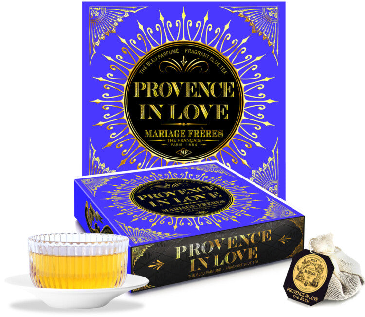 PROVENCE IN LOVE® is a vibrant blue tea capturing the essence of Provençal landscapes with lavender flowers and red fruit aromatics. Each cup reveals sun-kissed fruits and blooms, delivering a soothing, serene experience reminiscent of lavender fields beneath Mediterranean skies. Presented in 30 French cotton muslin sachets (75g) in a lavender-blue box with gold accents.