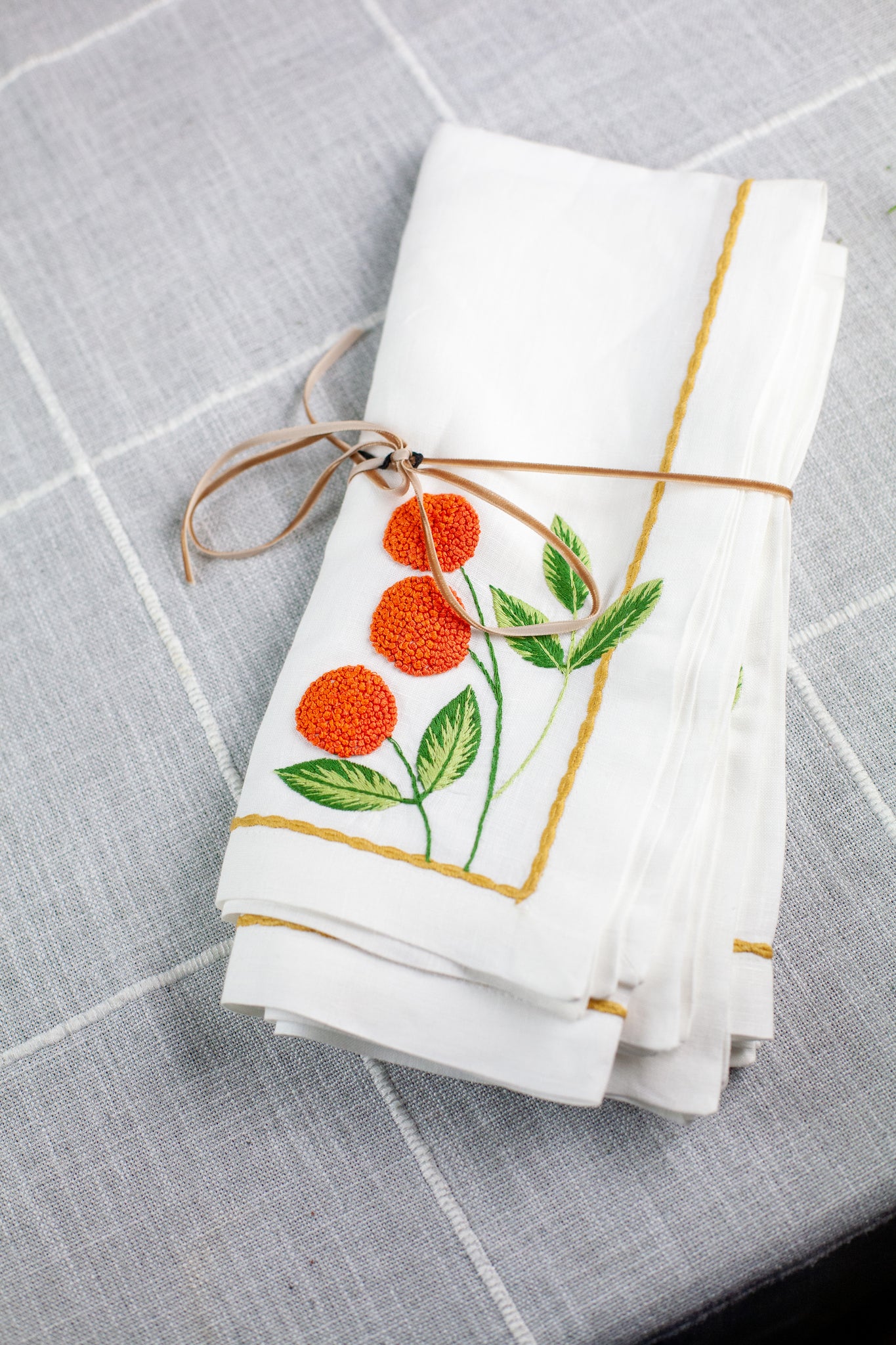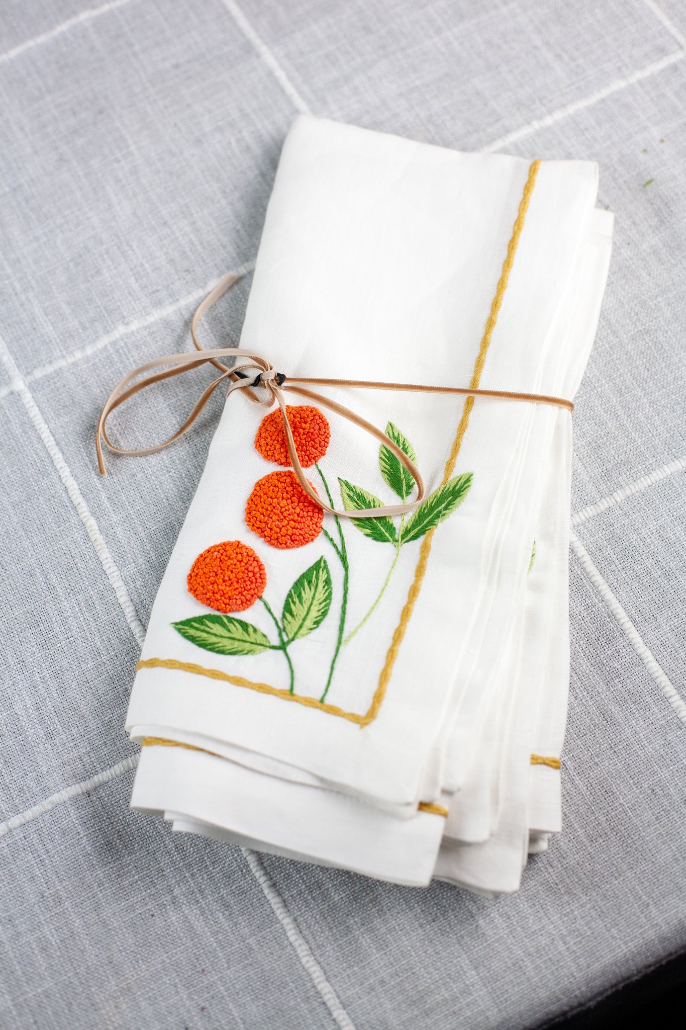 This elegant set of four Orange Blossom Napkins by Deborah Rhodes features a sophisticated floral design that brings botanical beauty to your table. Crafted with quality materials, the vibrant orange blossom pattern complements any décor while serving as both a practical essential and decorative accent. Perfect for everyday dining or special occasions.