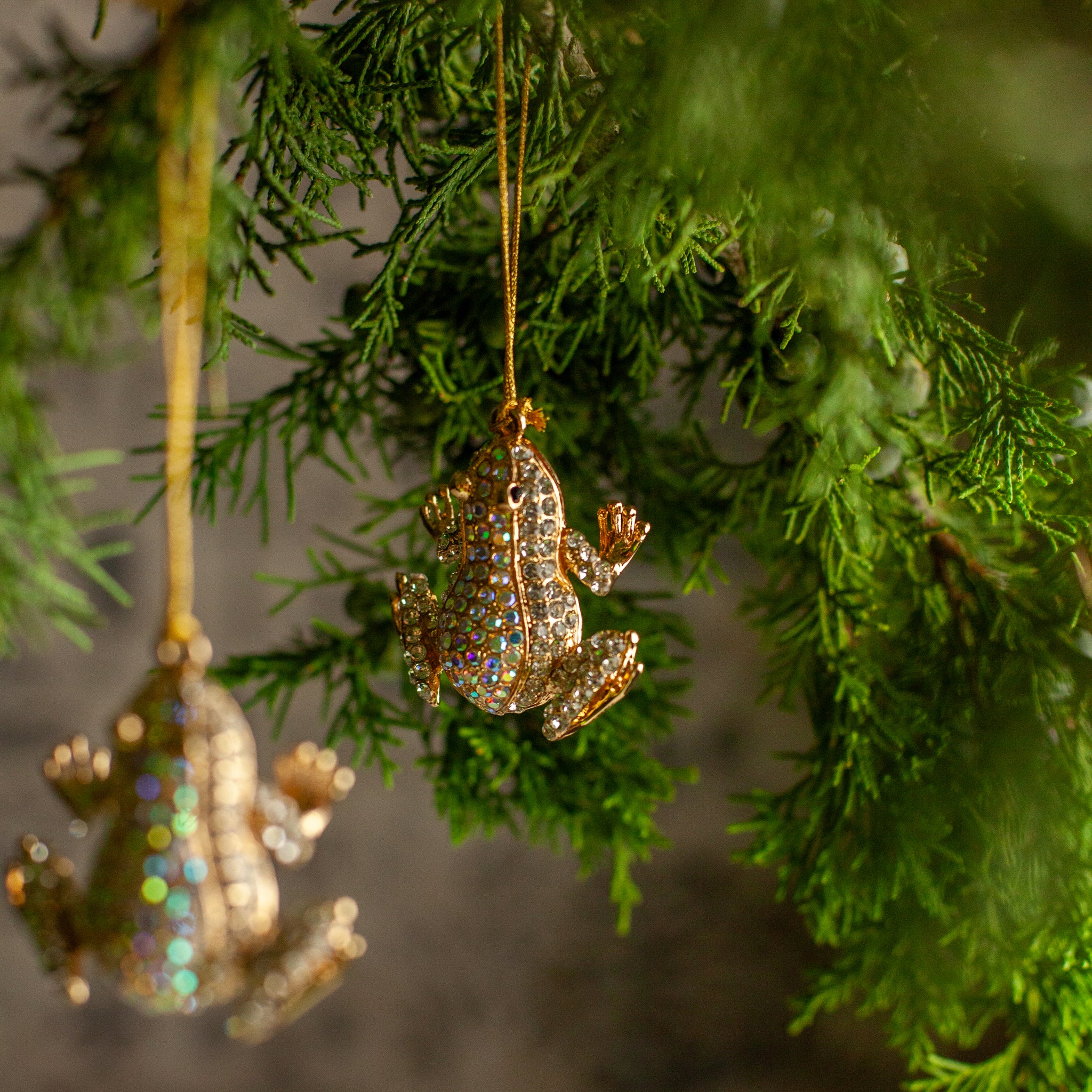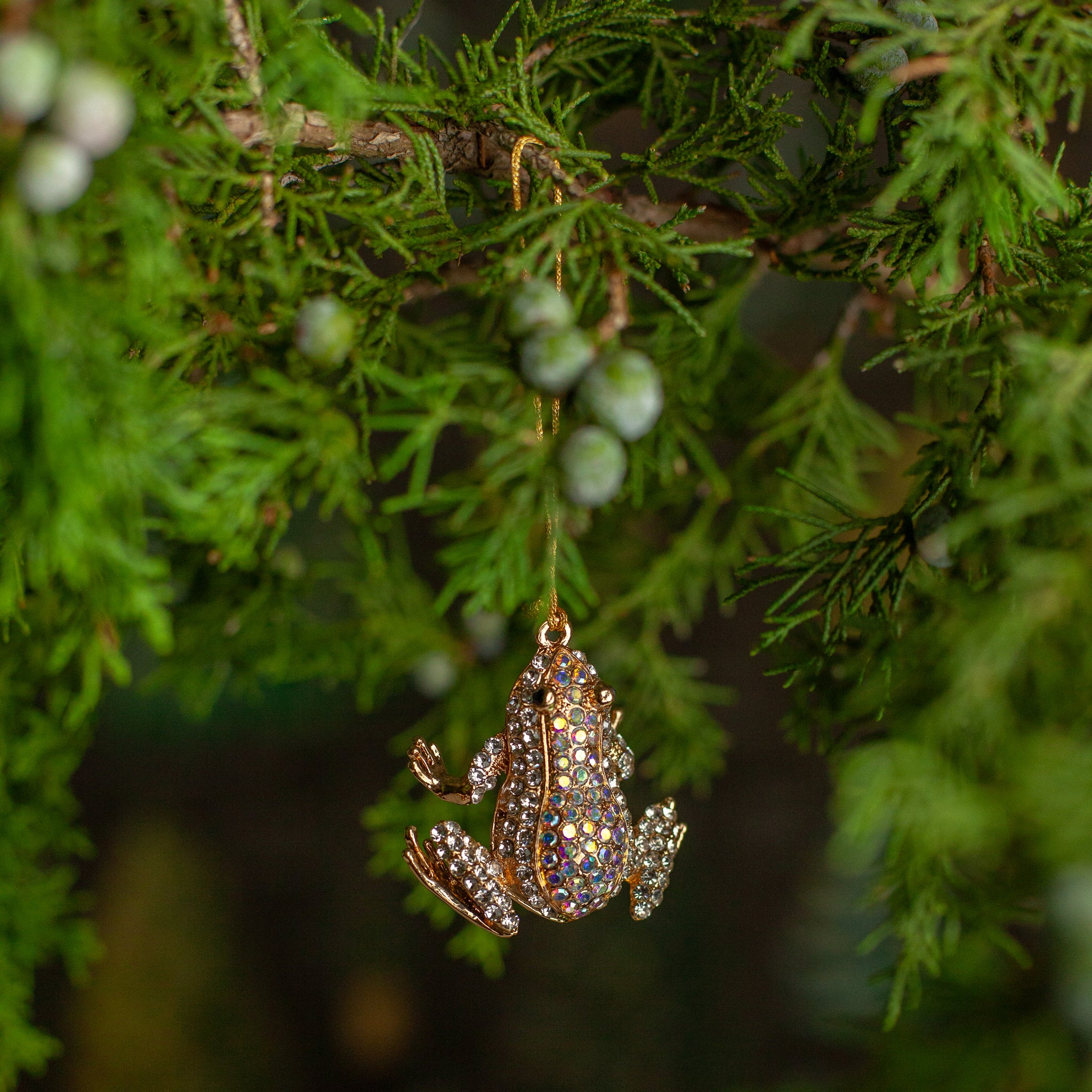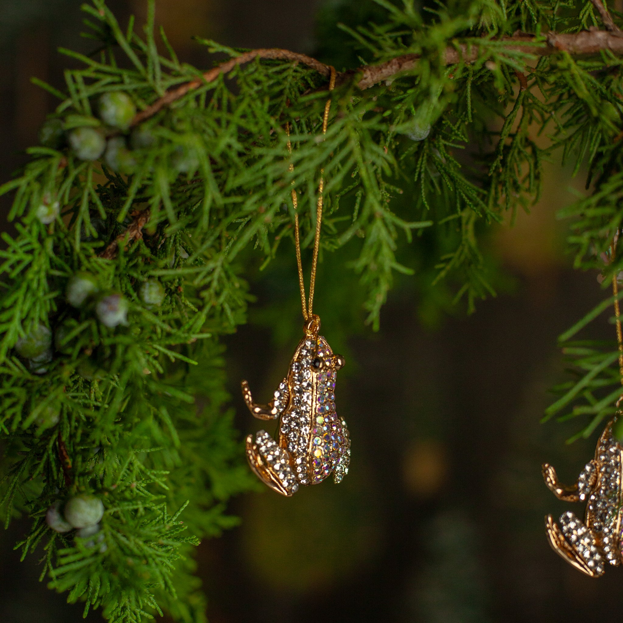 Add a touch of sparkling charm to your holiday decor with this set of three Rhinestone Frog Ornaments, each adorned with rhinestones and gold accents. Meticulously crafted, these frogs feature shimmering rhinestones that catch the light beautifully, making them perfect for this holiday season.